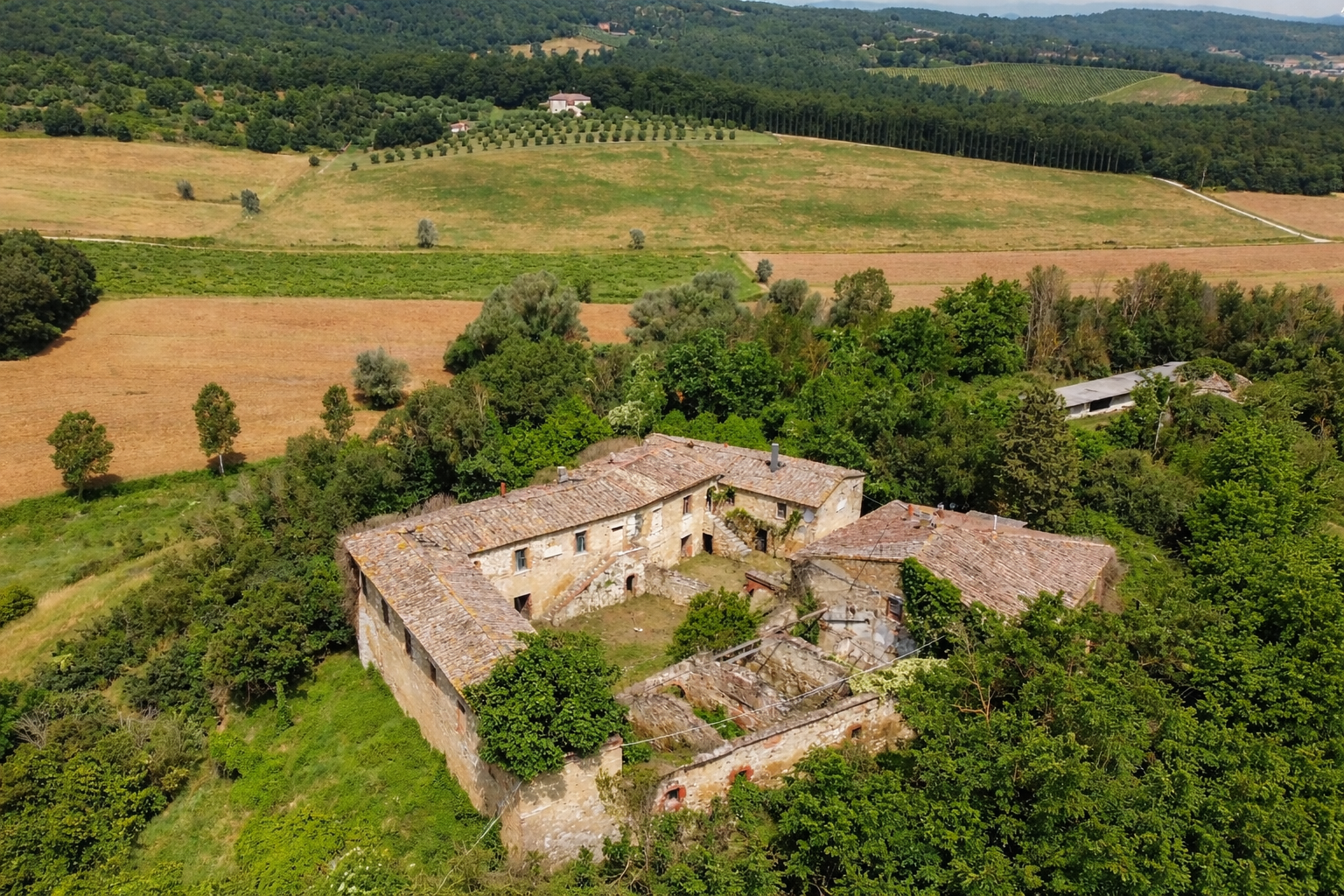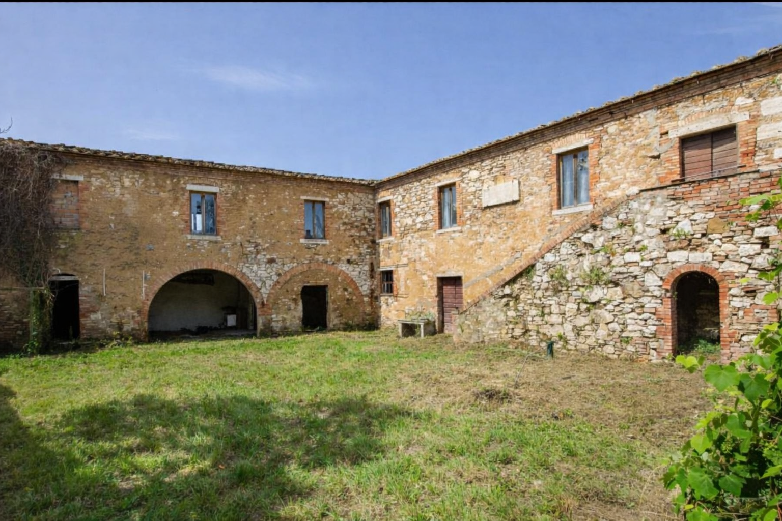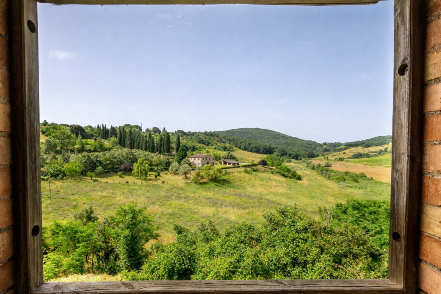 An 18th-century farming hamlet in the thermal hills of southern Tuscany. Two stone farmhouses joined by a private courtyard, three historic outbuildings, and sweeping views across the Crete Senesi — waiting to become something extraordinary.
